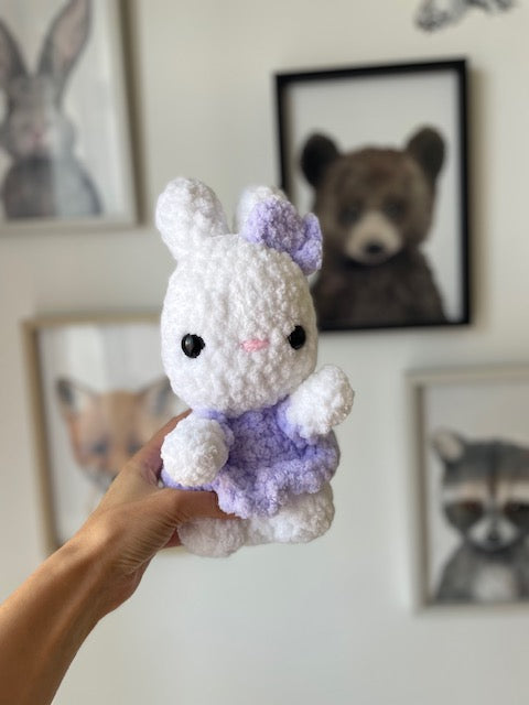 Suzy est une petite lapine toute douce, enveloppée dans sa robe violette, qui semble tout droit sortie d’un conte de fées. Avec son pelage ultra-fluffy et son regard tendre, elle incarne la douceur et la grâce. Sa robe légère et sa silhouette délicate ajoutent une touche de tendresse et d’élégance à son caractère déjà adorable. Suzy est le compagnon idéal pour ceux qui recherchent un peu de féerie dans leur quotidien. Prête à offrir câlins et sourires, elle est une véritable invitation à la douceur et à la rêverie.