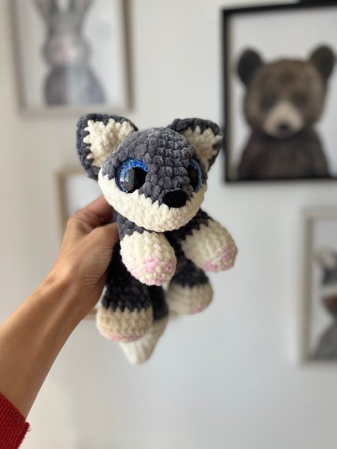 Ce petit loup tout doux, aux teintes gris et blanc, est un véritable compagnon de tendresse. Avec ses yeux bleus pétillants, Wren capture la magie des forêts.